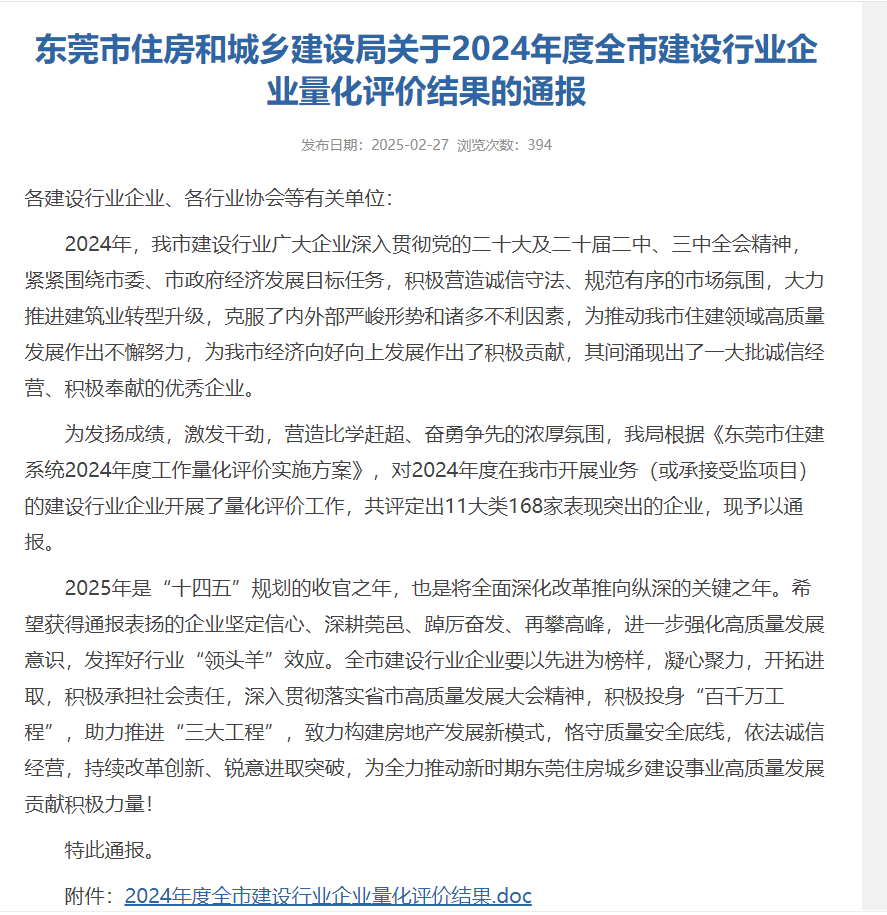 近日,東莞市住房和城鄉建設局發布《關于2024年度全市建設行業企業量化評價結果的通報》,廣東中青建筑科技有限公司憑借在房屋鑒定領域的技術實力、誠信經營和突出貢獻,成功獲評“房屋鑒定機構類優秀單位”的榮譽。?這是繼公司多次獲得行業認可后,再次斬獲的政府權威殊榮,標志著公司在專業能力、社會責任及行業影響力方面再上新臺階。