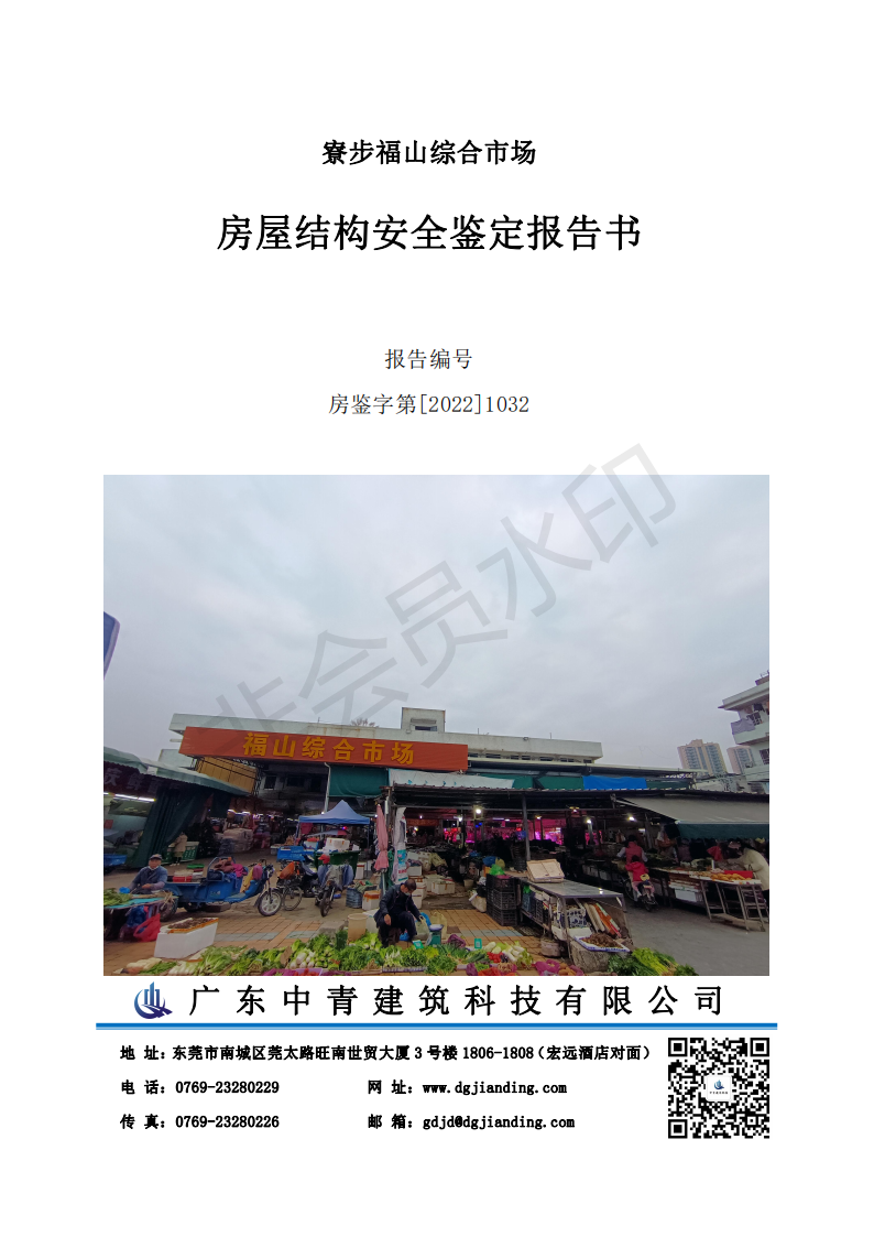 東莞市寮步福山綜合市場原為三層框架結構,約2293m2,2017 年該房屋 1/2-10×C-H 軸區域加建鋼結構屋蓋,房屋現狀使用功能為市場、店鋪、宿舍。委托方近期擬對市場進行升級改造,因擔心房屋結構安全性,故委托我司進行結構安全性鑒定。本次鑒定委托方未能提供原 設計圖紙、加建鋼結構屋蓋圖紙及房屋竣工驗收資料等。我司于 2022 年 1 月對該房屋進行現場檢測,因部分房間無法進入,未能對構件破損情況進行詳盡登記。